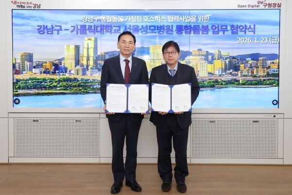 '강남구 통합돌봄 가정형 호스피스 협력사업’ 추진 업무협약식 ©강남구청 지난 23일 강남구와 가톨릭대학교 서울성모병원은 말기 암 환자의 퇴원 후 돌봄 공백을 해소하기 위한 ‘강남구 통합돌봄 가정형 호스피스 협력사업’ 추진 업무협약을 체결했다. 이번 협약은 고령화와 1인 가구 증가로 인해 가족의 돌봄 여력이 감소하는 사회 구조적 변화에 대응하고, 환자가