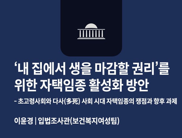 우리나라가 전 세계에서 가장 빠른 속도로 고령화가 진행되는 가운데, 본인이 살던 집에서 생을 마감하기를 원하는 국민의 바람과 현실 사이의 괴리가 큰 것으로 나타났다. 국회입법조사처가 지난 20일 발간한 '내 집에서 생을 마감할 권리를 위한 자택임종 활성화 방안' 보고서(이윤경 입법조사관)에 따르면, 장기요양 돌봄수급 노인의 67.5%가 자택 임종을 희망했으