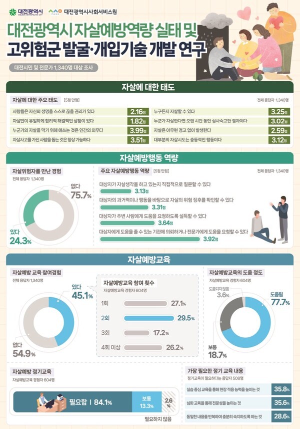 대전시는 2023년 2월부터 12월까지 대전시 사회서비스원 주관으로 실시한 「대전광역시 자살예방 역량 실태 및 고위험군 발굴·개입기술 개발」연구 결과를 발표했다.