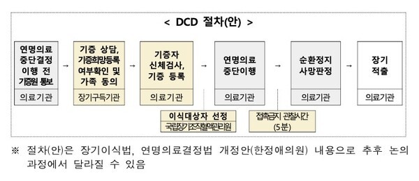 DCD는 연명의료 중단과 장기기증을 모두 희망하는 환자를 대상으로 하며, 제도 도입을 위해서는 '장기이식법'과 '연명의료법'의 개정이 필요하다. 정부는 법 개정과 더불어 임종 직후 수술 체계 마련, 체외 관류기기와 같은 관련 의료기기 도입도 검토할 방침이다.