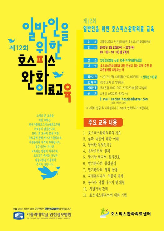 자세한 문의는 가톨릭대 인천성모병원 호스피스완화의료센터(☎ 032-280-6202~3)로 연락하면 된다.