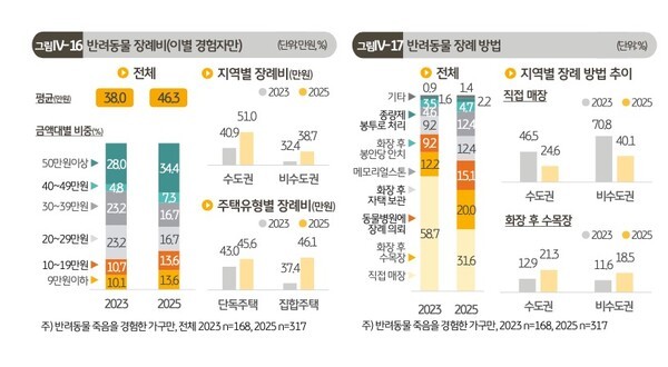 평균 장례비는 46만 3천 원으로 2023년 대비 8만 3천 원 증가했다. 반려동물을 야산에 직접 매장하는 경우(2023년 58.7% → 2025년 31.6%)는 급감한 반면, 화장 후 수목장(20.0%), 동물병원 의뢰(15.1%), 유골함 보관(12.4%), 메모리얼스톤 보관(12.4%) 등 반려동물을 가족으로 기억하려는 문화가 확산되는 것으로 나타났다.