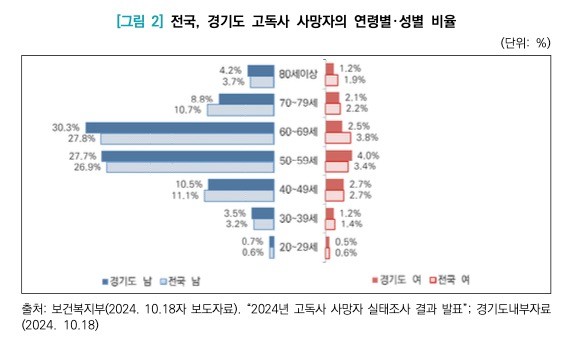 다만 고위험군은 50~60대 남성으로 명확히 드러났다. 보고서에서 경기도 고독사 사망자의 85.7%가 남성이었으며, 50~69세 중장년층이 전체 사망자의 58.0%를 차지해 전국 평균보다 높은 비율을 보였다.