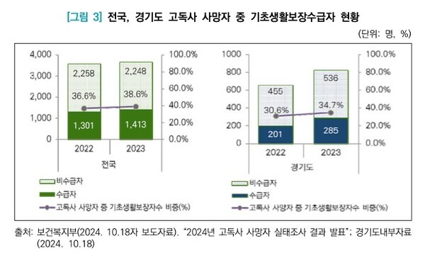 2023년 경기도 고독사 사망자가 922명으로 전국 광역 지자체 중 최다를 기록한 가운데, 경기복지재단은 지난 4일 발표한 '복지이슈 FOCUS 13호' 보고서에서 고독'사(死)'라는 죽음 중심의 접근에서 벗어나, '사회적 고립' 해소 및 '사회적 관계망 형성'으로 정책의 패러다임을 전면 전환해야 한다고 제언했다.