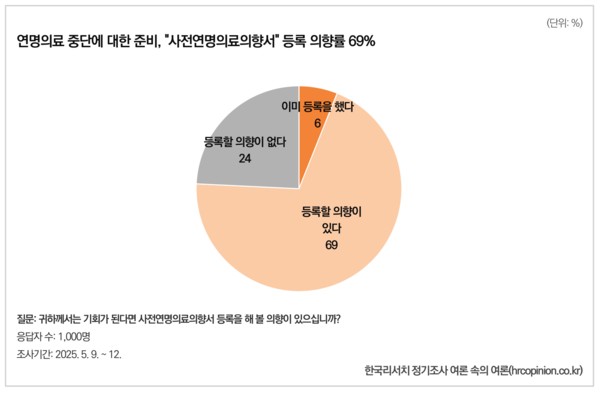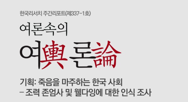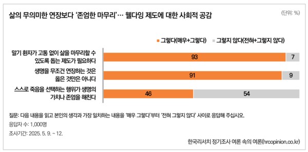 한국리서치 관계자는 “죽음을 선택할 권리에 대해 사회 전체가 본격적으로 논의할 시점”이라며 “국회와 정부가 ‘좋은 죽음’의 가치를 실현하기 위해 관련 제도와 기준 마련에 보다 적극적으로 나서야 한다”고 제언했다.