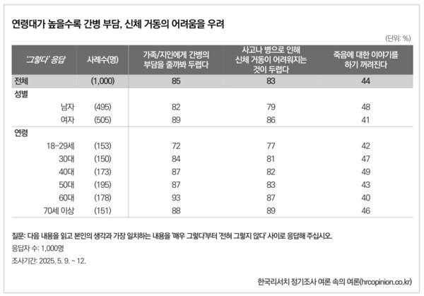 그러나 주체적인 인식 이면에는 타인에게 짐이 되는 것에 대한 두려움이 공존했다. 응답자들은 죽음에 대해 가장 두려운 점으로 ‘가족·지인에게 간병의 부담을 줄까 봐’(85%)와 ‘신체 거동이 어려워지는 것’(83%)을 꼽았다. 이러한 경향은 연령대가 높을수록 더욱 뚜렷하게 나타났다.