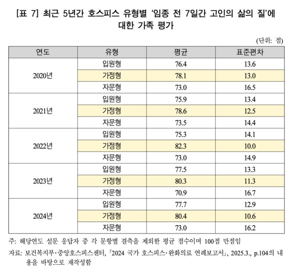 가정형 호스피스를 이용한 사별가족의 만족도도 매우 높게 나타났다. 2023년 만족도 조사에서 가정형 호스피스에 대한 '매우 만족' 응답률은 74.4%로, 입원형(53.2%)이나 자문형(49.3%)보다 월등히 높았다. 또한 임종 전 7일간 고인의 삶의 질 평가에서도 가정형 호스피스 이용자가 가장 높은 평가를 받아, 자택 임종이 '웰다잉(Well-dying)'에 중요한 역할을 하는 것으로 확인됐다.