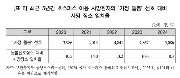 보건복지부, 중앙호스피스센터의 '2024 국가 호스피스·완화의료 연례보고서'를 분석한 결과, 지난해(2024년) 가정 돌봄을 선호한다고 답한 호스피스 환자 5,086명 중 실제 자택에서 생을 마감한 비율은 8.3%에 불과했다. 이는 2021년 14.0%, 2022년 13.2%, 2023년 10.6%에 이어 지속적인 감소 추세를 보이는 수치다.