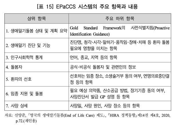 ‘전자 완화의료 조정 시스템(EPaCCS)’도 핵심 역할을 한다. 일반의(GP), 간호사, 구급대 등 다양한 의료진이 환자의 사전돌봄계획(ACP)과 상태(5단계 코드 분류)를 공유해 위기 상황 시 불필요한 응급실 이송을 막고 자택 임종을 지원한다. 그 결과 영국 성인 호스피스 이용자의 45%(2016년 기준)가 가정형 서비스를 이용할 만큼 자택 돌봄이 활성화되어 있다.