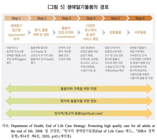 영국은 이코노미스트연구소(EIU)의 ‘죽음의 질 지수’ 평가에서 2010년과 2015년 연속 세계 1위를 차지하며 선진적인 임종 돌봄 국가로 꼽힌다. 이는 2008년 영국 보건부(DH)가 발표한 ‘생애말기돌봄(EOLC. End Of Life Care) 전략’을 통해 ‘좋은 죽음’을 정의하고, 인식을 전환한 결과다.