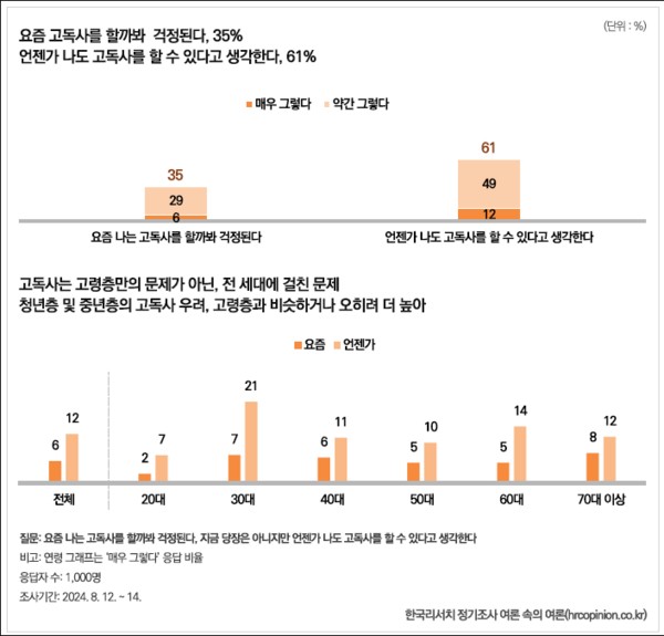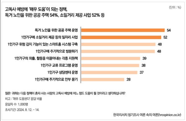 한국리서치 <여론 속의 여론> 팀은 지난 8월 12일부터 14일까지 전국 만 18세 이상 남녀 1,000명을 대상으로 실시한 ‘고독사에 대한 인식 조사’ 결과를 발표했다. 조사 결과, 국민 대다수는 고독사를 사회적 질병으로 인식하며 정부 차원의 포괄적인 예방 대책을 요구하고 있는 것으로 확인됐다.