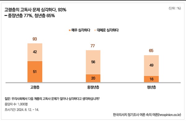 조사 결과에 따르면 우리 국민은 고독사 문제를 전 세대에 걸친 심각한 사안으로 받아들이고 있었다. 고령층의 고독사가 심각하다는 응답은 93%(매우 심각 51%)에 달했으며, 중장년층 고독사 문제에 대해서도 77%가 심각하다고 답했다.