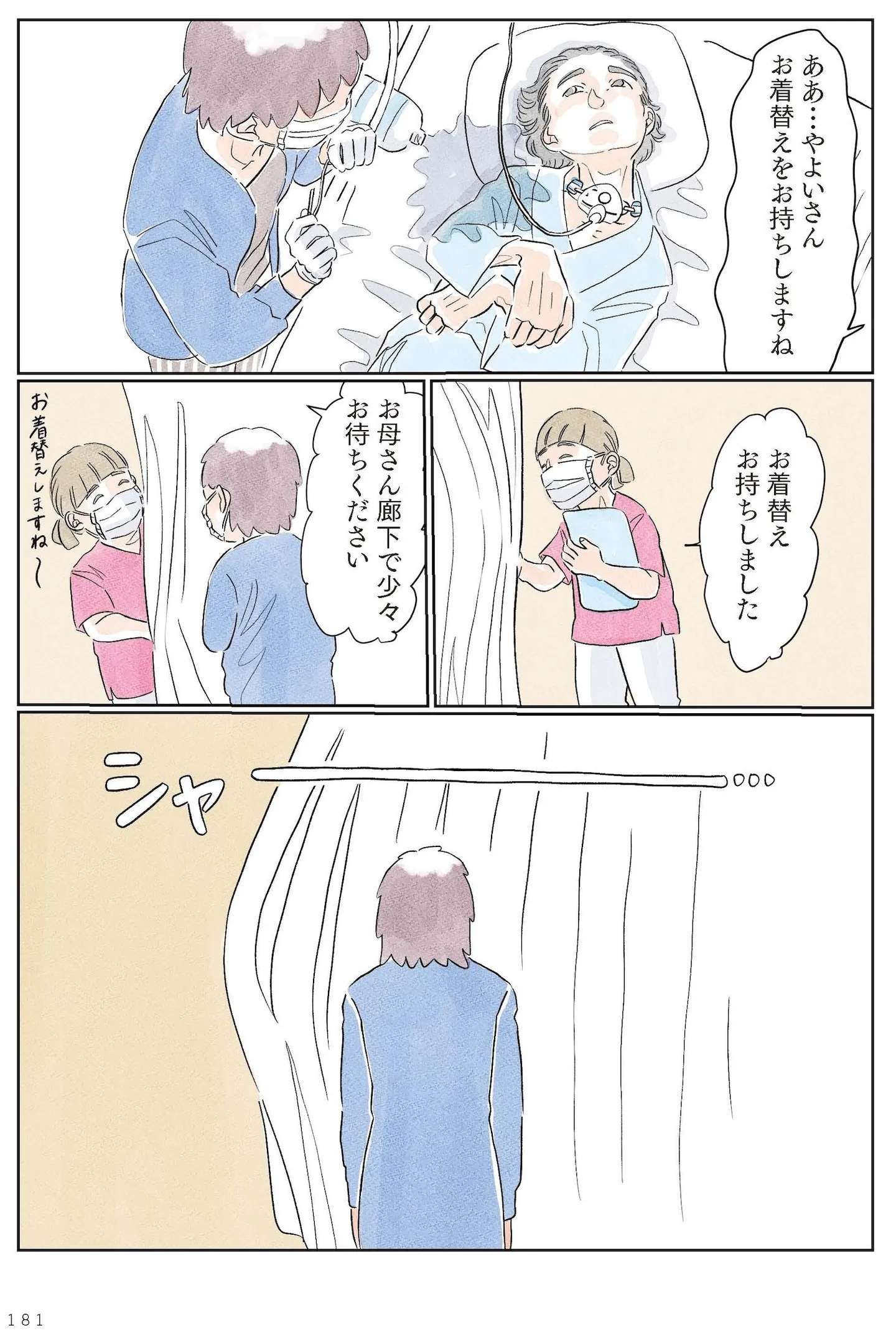 작품은 고령자 돌봄에 국한되지 않고, 난치병으로 누워 지내는 야요이의 간병 사례 등 다양한 연령대의 말기 상황을 다룬다. 이를 통해 간병과 임종의 문제가 사고나 질병으로 인해 누구에게나 닥칠 수 있는 현실임을 시사하고, 간병이 현실이 되었을 때 가족이 겪는 심리적 부담과 현실적 고민을 상세히 묘사했다.