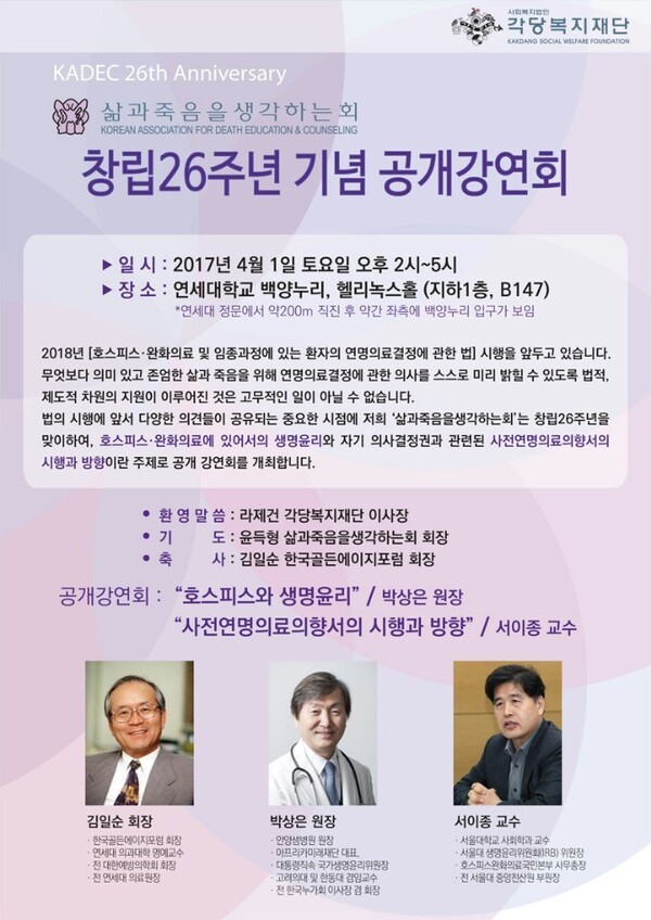 이번 강연회는 라제건 각당복지재단 이사장의 환영사를 시작으로, 김일순 한국골든에이지포럼 회장의 축사와 강연으로 진행된다. 강연 내용은 안양샘병원 박상은 원장이 '호스피스와 생명윤리'를 주제로, 서울대 서이종 교수가 '사전연명의료의향서의 시행과 방향'이라는 주제로 강연한다.