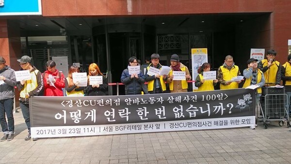 23일 아르바이트노동조합(알바노조)은 CU 본사인 BGF리테일 사옥 앞에서 기자회견을 갖고 항위 시위를 벌였다. 이들은 작년 12월 편의점 야간알바생 사망사건과 관련 CU 본사의 사과와 유족에 대한 합당한 보상을 요구했다. 또한 야간알바 안전대책을 마련하라고 요구했다.