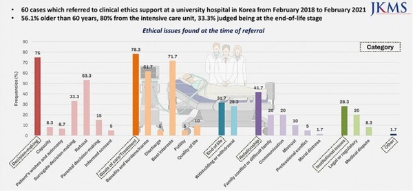 연구팀은 연명의료결정법 시행 후 3년 동안 서울대병원에서 발생한 임상윤리 지원 서비스에 의뢰된 총 60건의 특성과 그로 인해 파생되는 윤리적 문제를 분석하기 위해 후향적 코호트 연구를 시행했다.
