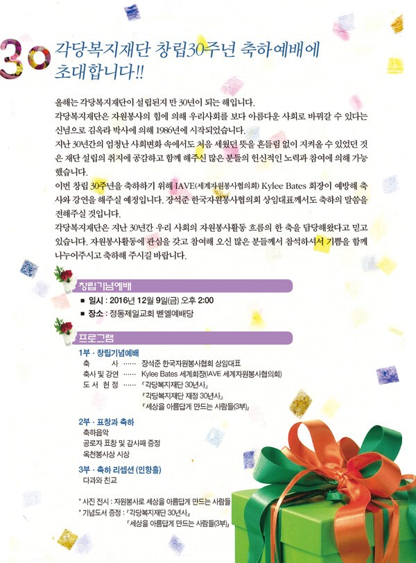 사회복지법인 각당복지재단이 12월 9일 창립 30주년을 맞이해서 기념행사를 개최한다.