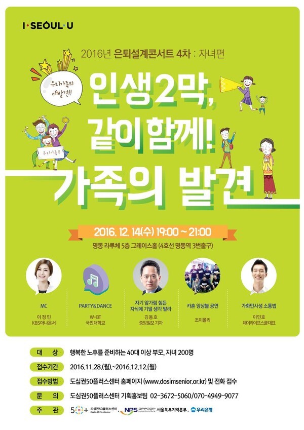 콘서트는 2016년 12월 14일(수) 19시부터 명동 라루체 5층 그레이스홀에서 진행되며 상담 및 토크콘서트 모두 무료로 진행된다. 콘서트에는 퇴직을 앞두고 있거나 이미 퇴직한 장년층(만50세~64세)과 자녀 200여 명이 함께 참여할 수 있다.