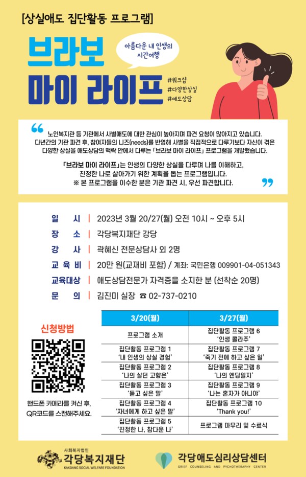 [2023. 3. 20. / 3. 27.] 상실애도 집단활동 프로그램 "브라보 마이 라이프" _ 각당복지재단 2026-03-25 16:04 (수)
