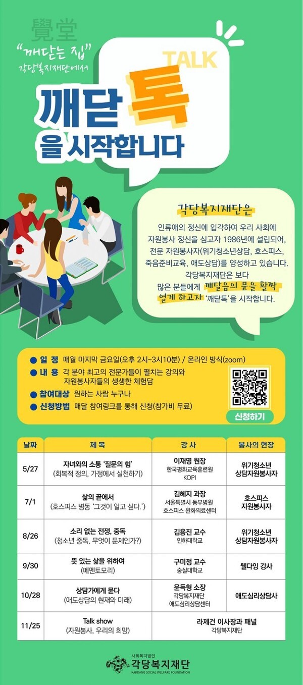 각당복지재단이 '깨닫는 집'이라는 재단의 정체성을 담아, '웰다잉', '호스피스', '중독', '위기청소년상담' 등 우리 사회의 핵심 의제를 대중과 함께 논의하는 실시간 온라인 공개강좌 '깨닫톡'을 5월부터 신설한다.